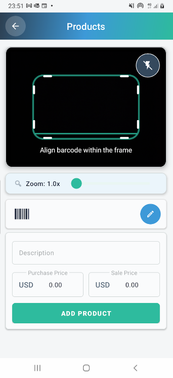 After scanning, you can enter the product description, along with its purchase price and sale price, and save the information with a single tap.