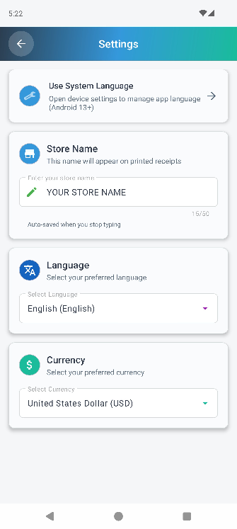 This option lets you customize the currency used throughout the app — including product prices and transaction details. Simply select your desired currency from the available list, and the currency symbol and display format will instantly update, while your numerical data remains the same.